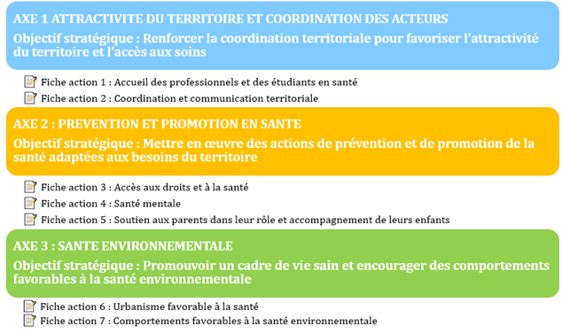 L’élaboration de ce 3ᵉ Contrat Local de Santé s’est appuyée sur trois axes stratégiques, qui ont structuré l’ensemble de la démarche de concertation. Les travaux ont réuni à deux reprises un groupe composé d’élus, d’acteurs de santé, du médico-social et d’institutions partenaires. Cette mobilisation collective a permis d’identifier les priorités locales et de construire un programme d’actions structuré autour de sept fiches actions.